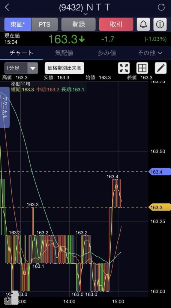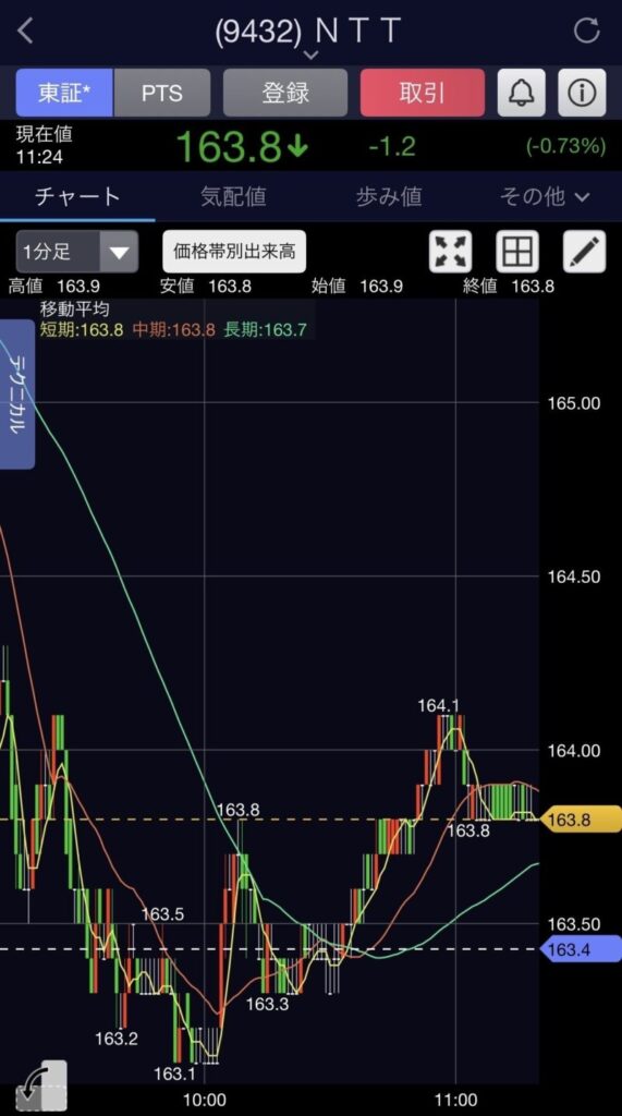 - 9時と11:15の買いエントリー(1分足・11:12時点)