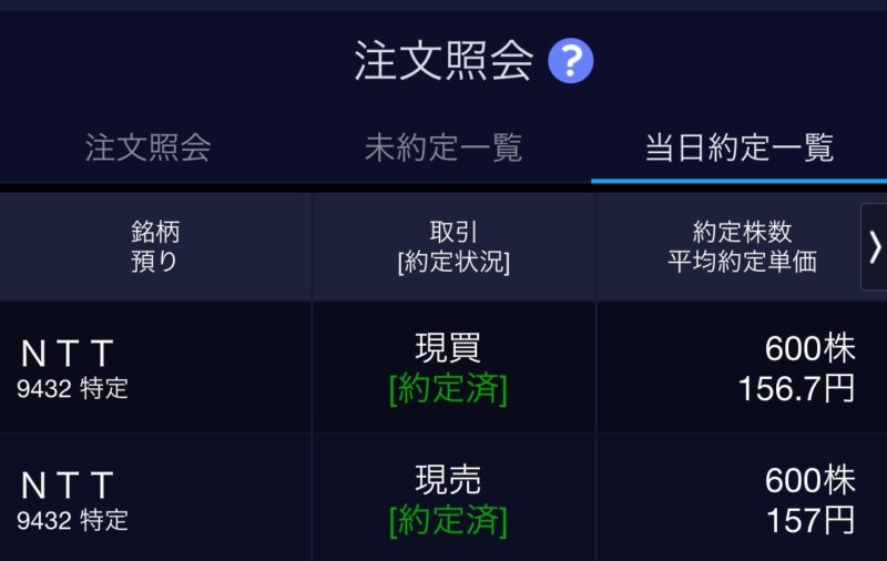 | 売り | 09:09 | 300株 | 156.3円 | +150円 |