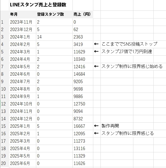 自分用の記録として、スタンプ数と月ごとの売上を表にまとめていました👇